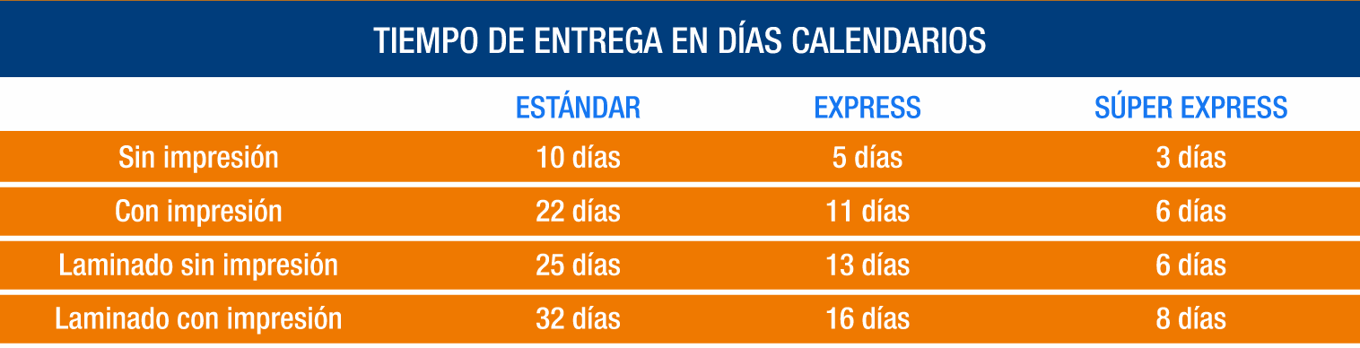 Con el fin de ayudar en el crecimiento y cumplimiento de su empresa, contamos con el servicio Express y Super Express, con el cuál nos comprometemos a entregar sus pedidos en menor tiempo al normal.